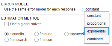 Моделью ошибок по умолчанию является постоянная модель ошибок. SimBiology поддерживает постоянные, пропорциональные, экспоненциальные и комбинированные модели ошибок. Дополнительные сведения см. в разделе Модели ошибок. Теперь используйте модель постоянной ошибки.
