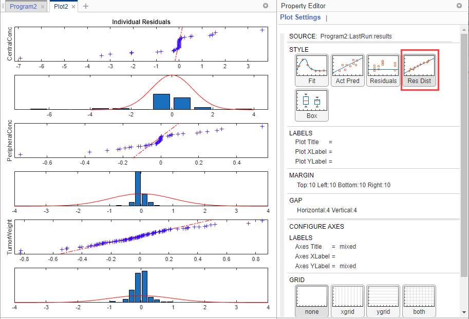 Далее рассмотрим график распределения остатков. Щелкните результаты в папке LastRun. Затем щелкните Остаточное распределение (Resident Dist) в разделе График (Plot) на вкладке Главная страница (Home).