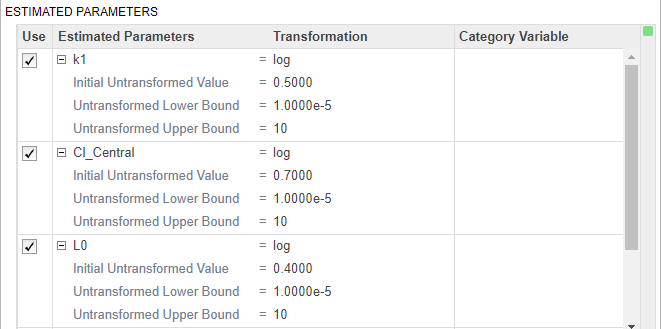 По умолчанию этот параметр преобразуется в журнал, как указано в журнале преобразования. Преобразование можно изменить на «без преобразования». none, probit, или logit трансформация. В этом примере следует сохранить преобразование журнала по умолчанию, поскольку оно часто улучшает сходимость. Для параметра Начальное нетрансформированное значение (Initial UnTransformed Value) автоматически устанавливается значение модели, равное 0,5.