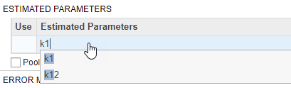 Определите параметры модели для оценки в таблице Предполагаемые параметры (Estimated Parameters). Дважды щелкните пустую ячейку в столбце «Расчетные параметры» и введите k1. Приложение показывает компоненты модели с соответствующими именами. Выбрать k1 из списка.