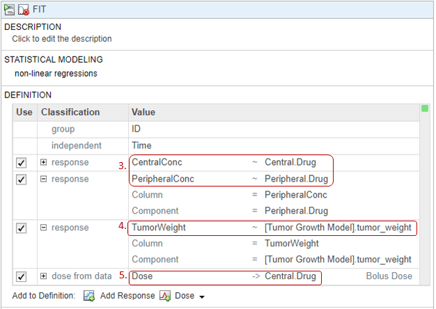 Определите сопоставление между компонентами модели и столбцами данных из экспериментальных данных. В частности, сопоставьте CentralConc с модельным видом Drug в центральном отделении (Central.Drug). Аналогично, сопоставьте CouncedConc с Peripheral.Drug.