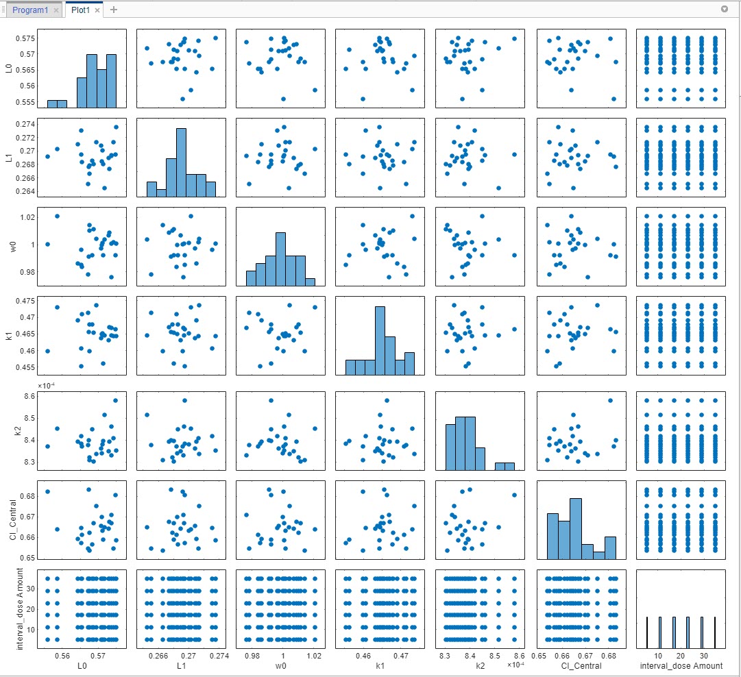 Визуализация созданных образцов. В левой панели браузера разверните папку Program1. Разверните папку LastRun и щелкните образцы. В разделе Печать (Plot) на вкладке Главная (Home) щелкните Матрица печати (Plot Matrix). График показывает распределение каждого параметра, изменяющегося вокруг его модельного значения, за исключением количеств доз, которые появляются в однородном диапазоне. Обратите внимание, что график может отличаться от графика, показанного здесь, из-за случайности.