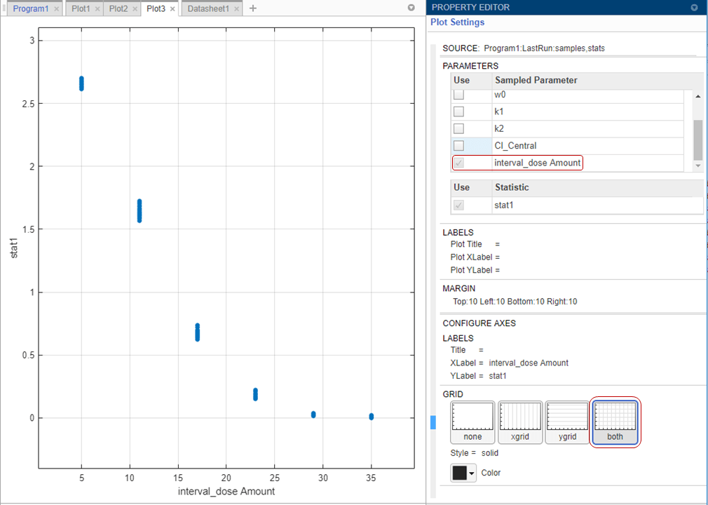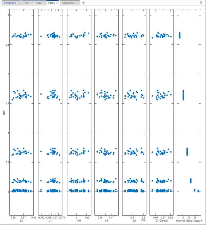Повторно запустите этап моделирования, нажав кнопку запуска в верхней части шага. Приложение моделирует и оценивает stat1 выражение для каждого сценария моделирования или итерации и создает следующий график. Ось x представляет параметры, а ось y представляет минимальный вес опухоли. Каждая точка представляет сценарий моделирования. График также показывает, что нет корреляции между размером опухоли и значениями различных параметров модели, за исключением количеств дозы (самый правый подграф).