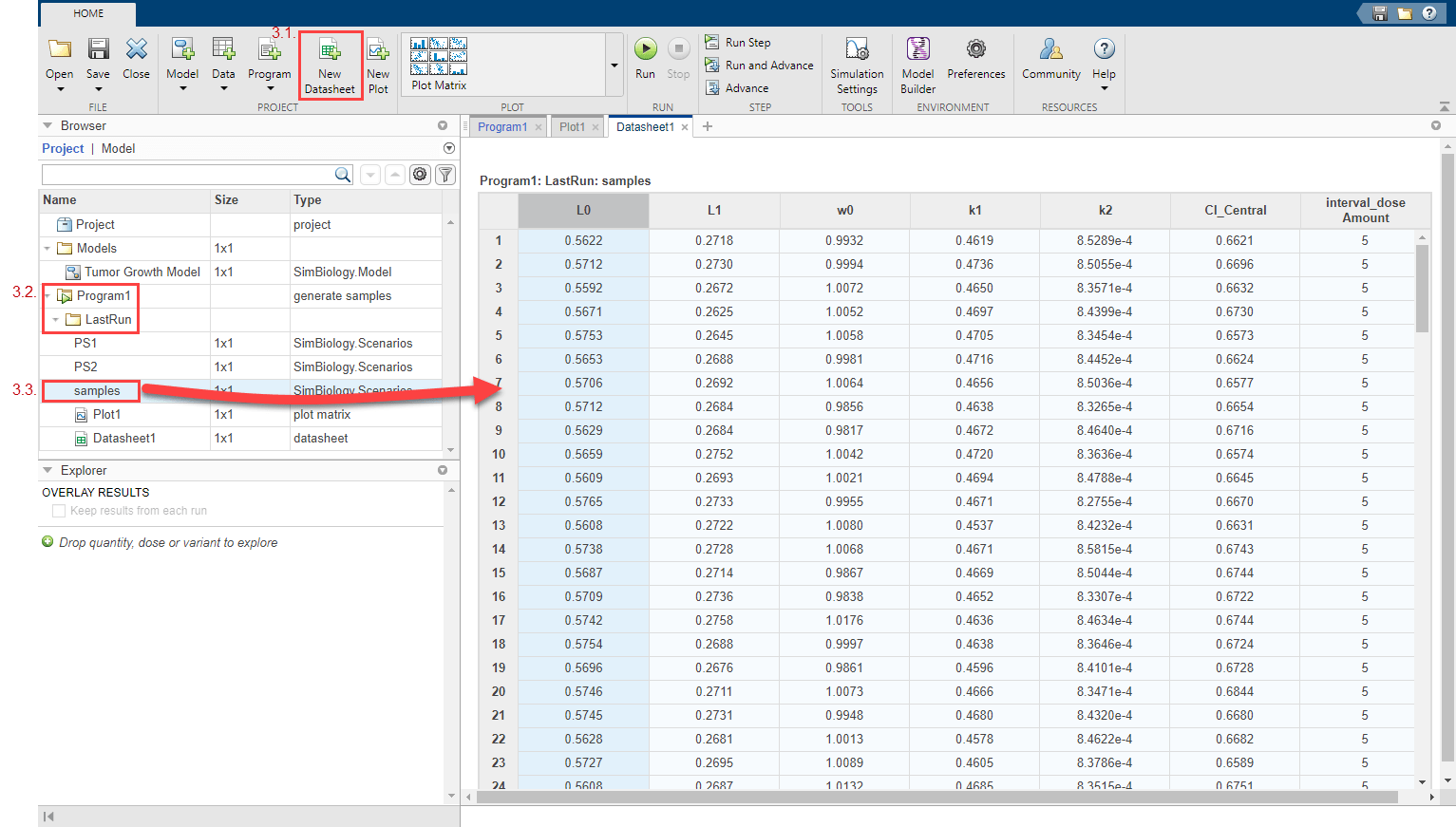 Отображение созданных виртуальных пациентов и комбинаций доз численно в табличном формате. На вкладке Главная щелкните Создать таблицу. Из папки LastRun программы перетащите образцы в новую таблицу данных. Каждая строка таблицы представляет сценарий моделирования с различными значениями параметров модели и дозами.