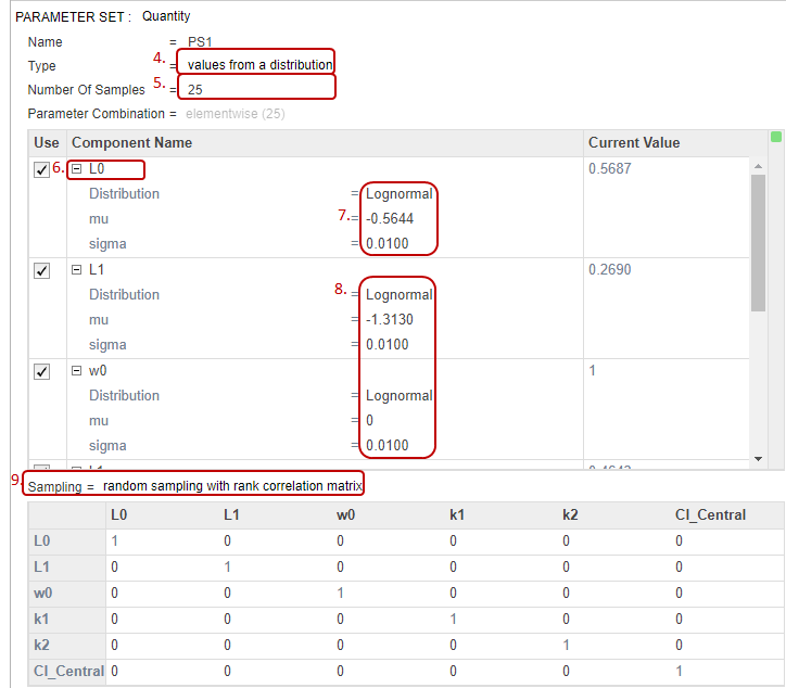 Дважды щелкните пустую ячейку в столбце «Имя компонента» и добавьте L1. Повторите тот же процесс, чтобы изменить распределение на логнормальное и установить значения mu и sigma. Аналогично, добавьте w0, k1, k2 и ke. В этой таблице перечислены соответствующие значения mu этих параметров, которые можно скопировать и вставить в программное обеспечение. Измените сигму на 0,01 для каждого параметра.