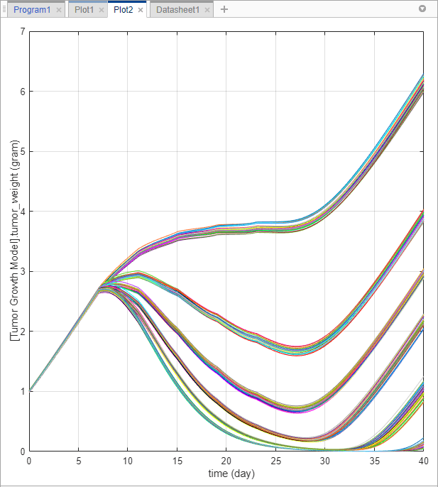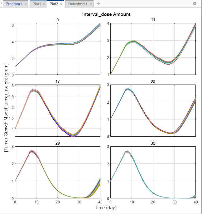 Как только вы подготовите образцы, вы можете смоделировать модель, чтобы исследовать рост опухоли у виртуальных пациентов, получающих разное количество дозы.