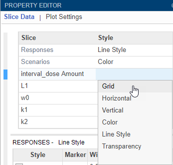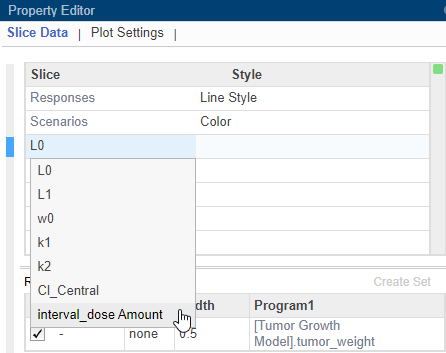 Данные среза можно разделить с помощью различных переменных среза. Каждая переменная среза отображается на графике с различным визуальным стилем (или каналом), таким как цвет, стиль линий и положение осей. Переменные среза могут представлять атрибуты данных, такие как ответы или сценарии (т.е. группы или прогоны моделирования). Разделяющие переменные также могут быть ковариатами или значениями параметров, связанными со сценарием или группой. По умолчанию приложение предоставляет разделенные переменные для различных переменных ответа и различных сценариев в построенных данных. Можно добавить другие визуальные стили (или каналы) для наборов ответов и связанных переменных параметров или ковариат.