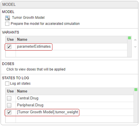 На шаге настройки модели в разделе Исполнения убедитесь, что выбран параметр parameterEstimates. В разделе Состояния для регистрации установите флажок для просмотра состояний и снимите все флажки, кроме [Модель роста опухоли] .tumor _ weight.