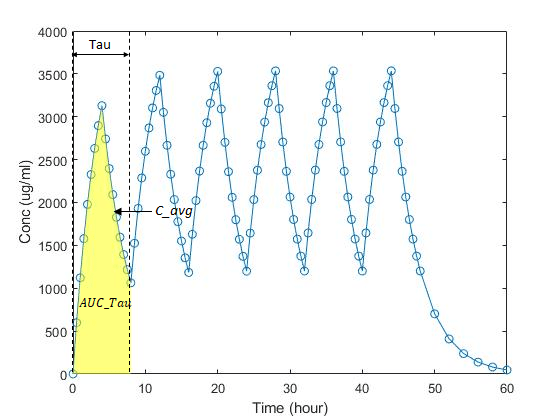 | AUC_Tau | Площадь под кривой концентрация-время во время периода дозирования длиной Tau. SimBiology использует первый период, то есть после первой дозы и перед второй. dt. |
