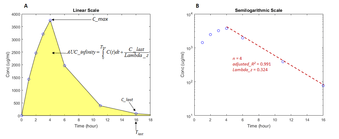 На фигуре А показаны данные концентрации-времени в линейном масштабе и показано, как вычисляется AUC от времени 0 до бесконечности. На фигуре В показаны те же самые данные в полулогарифмическом масштабе. Для вычисления константы терминальной скорости (Lambda_z) SimBiology выполняет набор линейных регрессий логарифмических данных, используя каждую из последних n точек (n = 3, 4, 5, ...) от конечной части кривой. Lambda_z выбирается из регрессии, которая использует наибольшее количество точек и имеет максимальную adjusted_R2.
