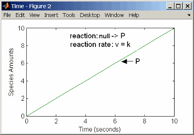 Если в предыдущем примере указаны начальные суммы a и b являются 0.01 и 0.005 соответственно, без указания единиц, SimBiology проверяет, DefaultSpeciesDimension является substance или concentration. Если DefaultSpeciesDimension является concentrationи вы устанавливаете единицы на константу скорости так, чтобы размеры скорости реакции соответствовали концентрации/времени, SimBiology масштабирует количества видов для емкости отсека и возвращает значения видов в концентрации.