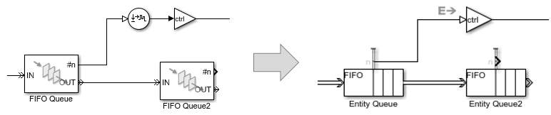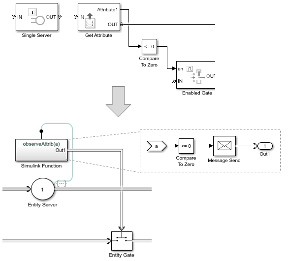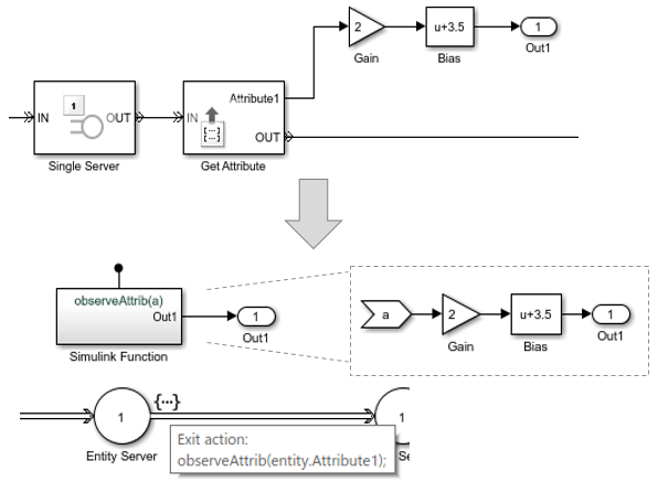В предыдущих выпусках блоки Get Attribute используются для вывода значений атрибутов сущности. SimEvents 5.0 более тесно связан с Simulink ®. Эта тесная связь позволяет использовать традиционные инструменты Simulink для получения значений атрибутов. Замените блоки Get Attribute с помощью этих инструкций.