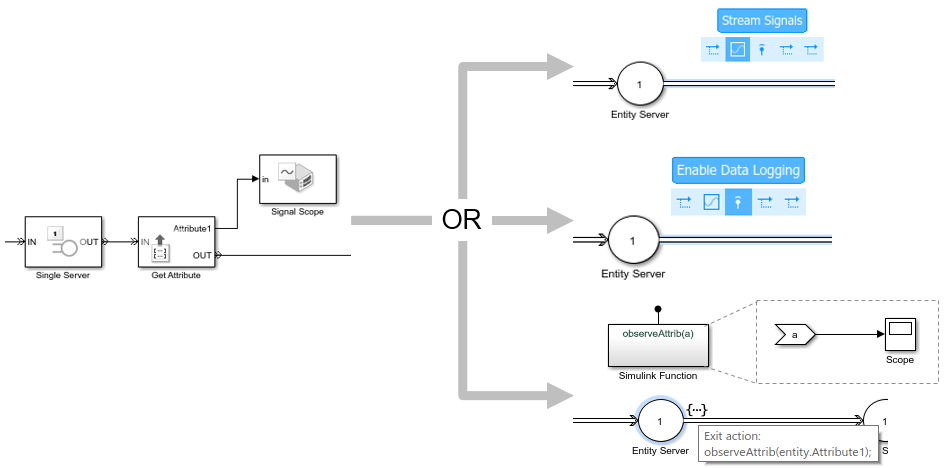 Если для наблюдения за выводом используются блоки «Получить атрибут», см. раздел Наблюдение за выводом. Например, можно использовать инспектор данных моделирования для визуализации объектов из блока генератора объектов. В этом примере показано, как визуализировать объекты с помощью инспектора данных моделирования, ведения журнала и области.