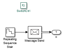 Дважды щелкните блок Simulink Function. Добавьте блок «Повторяющаяся лестница последовательности» и задайте для его параметра «Время образца» значение -1 (наследуется), блок отправки сообщений и блок Out1. Подключите блоки, как показано на рисунке.