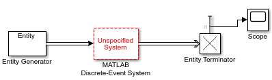 Откройте блок системы дискретных событий MATLAB и установите имя объекта системы дискретных событий в значение CustomEntityStorageBlock.