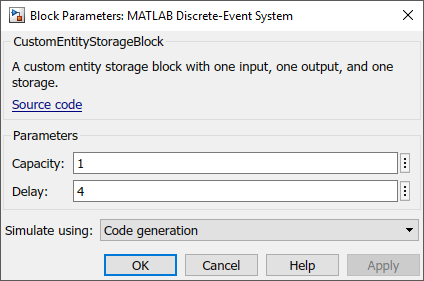 Дважды щелкните по блоку MATLAB Discrete-Event System, чтобы проверить его емкость и задержку.