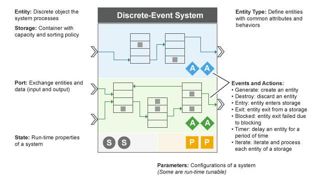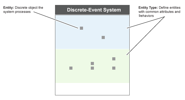 Можно запланировать выполнение событий для объекта системы с дискретным событием. События связаны с пользовательскими действиями. Действие события определяет пользовательское поведение путем изменения значений состояния или сущности и выполнения следующего набора событий.
