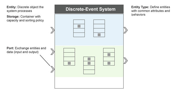 Во время моделирования объект всегда занимает единицу пространства хранения. Такие пространства хранения обеспечиваются элементами хранения объектов. Объект System с дискретным событием может содержать несколько элементов хранения объектов. Используйте getEntityStorageImpl способ определения элементов хранения. Пространство хранения - это контейнер со следующими свойствами: