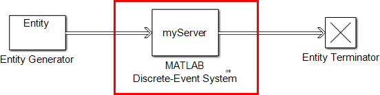 Значок блока системы дискретных событий MATLAB и метки портов обновляются до значков и меток соответствующего объекта System. Предположим, что выбран объект System с именем myServer в текущей папке и создать настраиваемый блок сервера сущностей, который обслуживает сущности и выводит каждую сущность через порт вывода. Затем блок обновляется, как показано в модели.