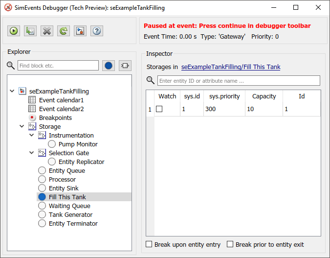 Кроме того, чтобы задать точки останова для всех блоков хранения одновременно, щелкните элемент хранилища на панели проводника. Обратите внимание, что блок «Заполнить этот резервуар» подсвечен, поскольку он содержит объекты.
