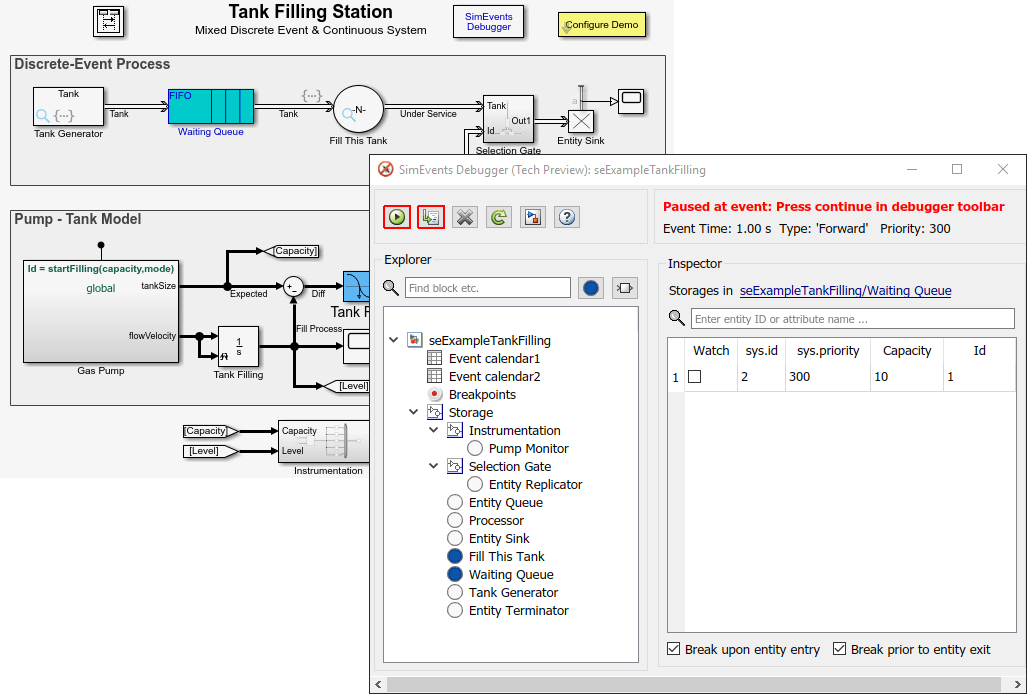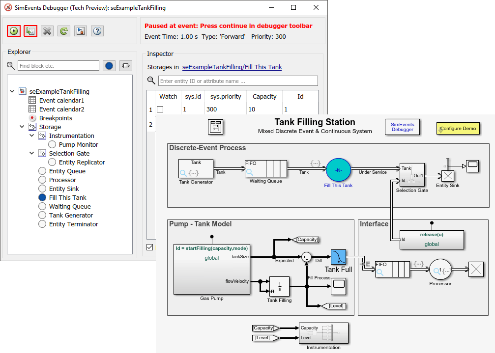 Отладчик SimEvents используется в Tank Filling Station пример, чтобы выполнить пошаговое моделирование модели, установить точки останова и изучить календарь событий.