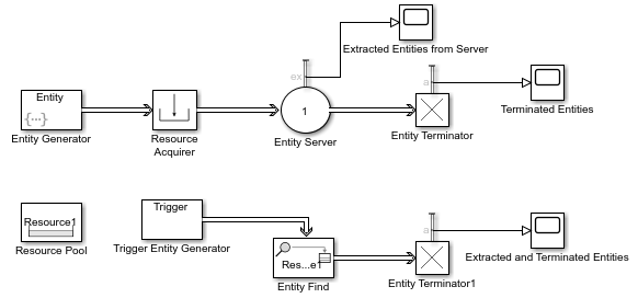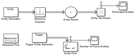 Добавьте блок генератора сущностей, блок пула ресурсов, блок сбора ресурсов, блок сервера сущностей и блок терминатора сущностей.