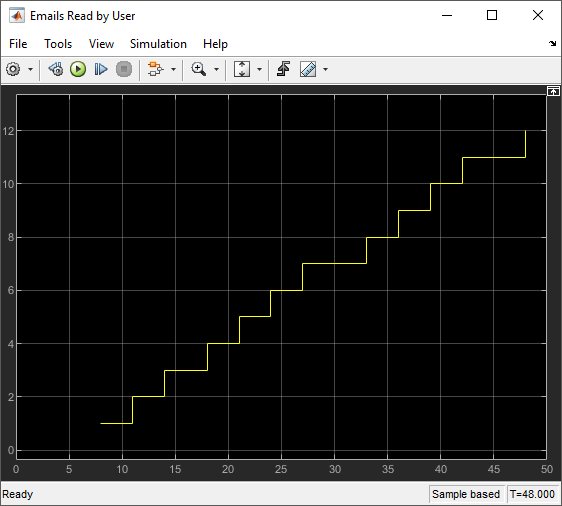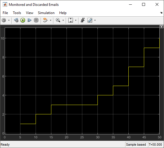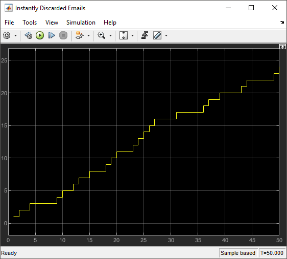Увеличение времени моделирования до 50 и смоделировать модель. Наблюдайте за сообщениями электронной почты, которые немедленно отбрасываются или отбрасываются после мониторинга.
