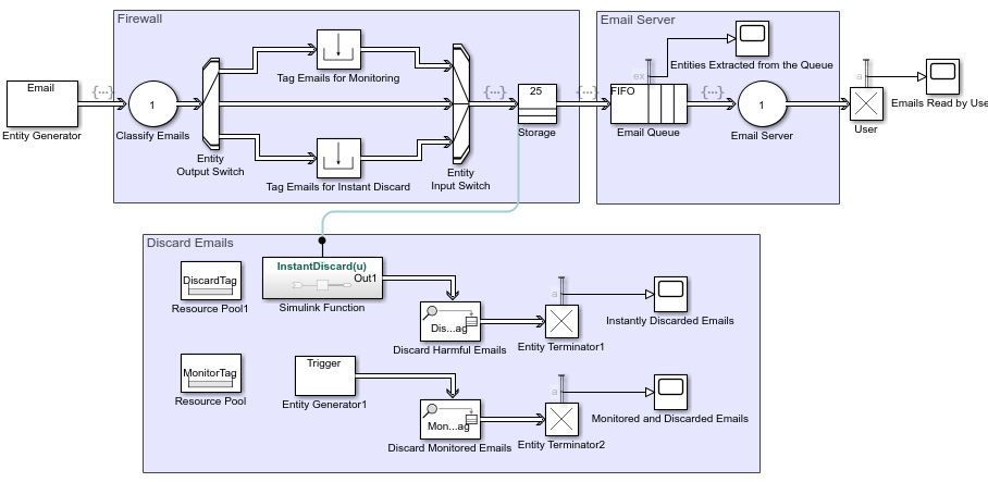 В этом примере представлен сервер электронной почты с брандмауэром для отслеживания, отслеживания и удаления вредоносных сообщений электронной почты до того, как они достигнут пользователя. В модели сообщения электронной почты поступают из Интернета через блок генератора сущностей. В компоненте Брандмауэр сообщения электронной почты классифицируются как опасные для мгновенного удаления, подозрительные для мониторинга или безопасные в зависимости от источника. Вредные сообщения электронной почты помечены тегом DiscardTag ресурс из блока пула ресурсов и мгновенно отбрасывается из системы. Подозрительные сообщения электронной почты помечены тегами MonitorTag и отслеживается по всей системе на предмет подозрительной деятельности. При обнаружении подозрительных действий сообщение электронной почты отбрасывается до того, как оно достигнет пользователя. Безопасные сообщения электронной почты не отслеживаются и не отбрасываются.