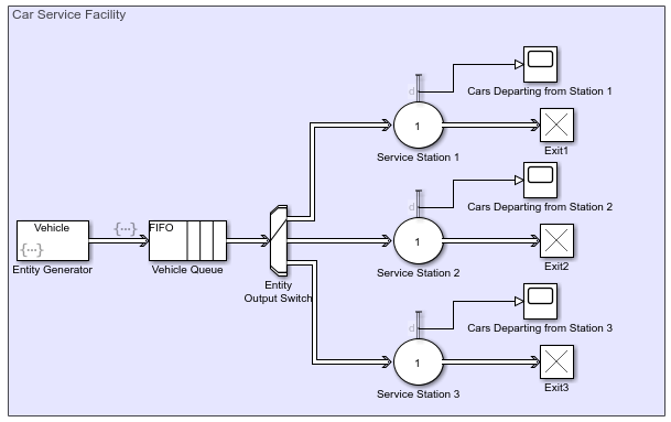 Средство имеет три станции обслуживания, представленные тремя блоками сервера сущностей. Прибывшие на объект транспортные средства ставятся в очередь и затем направляются на одну из трех станций обслуживания в зависимости от их размера и пробега. Предполагается, что старым транспортным средствам требуется больше времени на обслуживание.