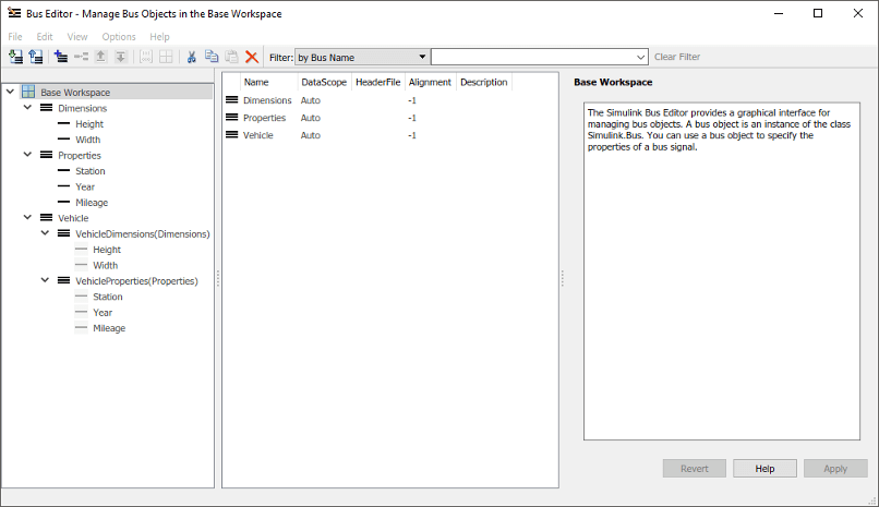 Добавьте два элемента шины и задайте для их свойств Name значение VehicleDimensions и VehicleProperties. Для свойств типа данных используйте Bus: <object name> шаблон, замена <object name> с Dimensions и Properties.