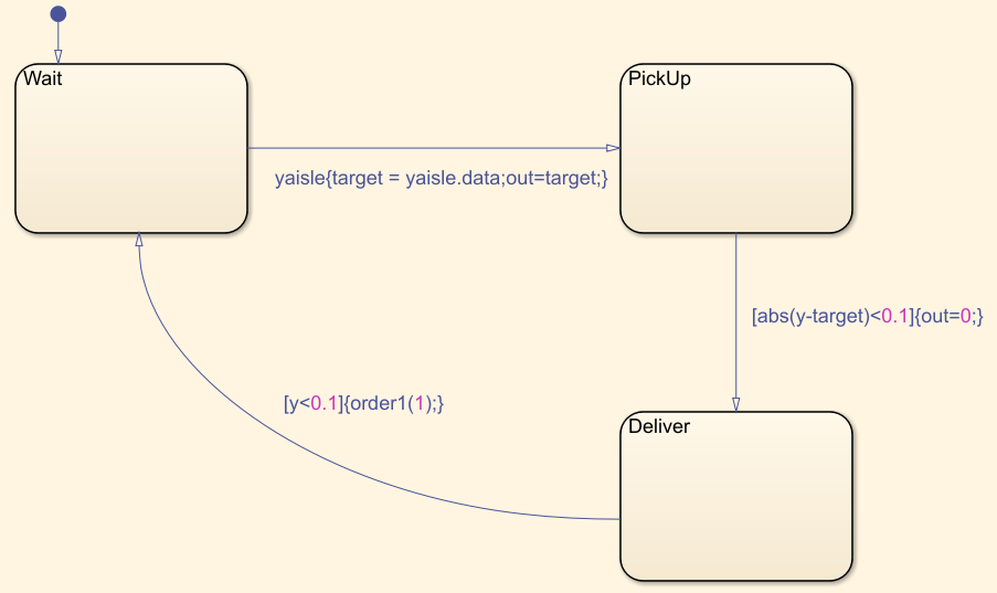 Когда робот возвращается и это 0.1 единицы от y = 0, он переходит к Wait состояние. В районе 320, подсистема Robot1 доставляет элемент и переходит обратно в Wait состояние.