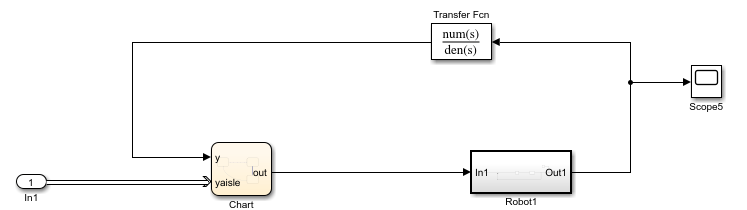 Подсистема Robot1 предназначена для отслеживания опорного сигнала от блока In1, который является out сигнал от блока дискретной диаграммы событий. Система сравнивает входное значение с выходным сигналом блока State-Space, и разность между сигналами подается в блок PID Controller.
