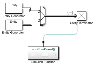 Добавьте два блока генератора объектов, блок переключателя ввода объектов, блок терминатора объектов и блок функции Simulink из библиотеки SimEvents ® в новую модель. Дополнительные сведения см. в разделе Функция симулятора.