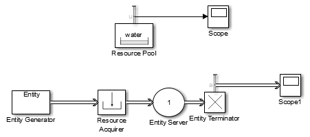 Откройте новую модель и добавьте блоки Пул ресурсов (Resource Pool), Генератор сущностей (Entity Generator) и Получатель ресурсов (Resource Acquirer). Для блока пула ресурсов: