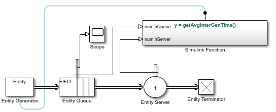 Некоторые системы полагаются на статистику, чтобы повлиять на динамику. В этом примере система очередей с отклоненными поступлениями имеет цикл обратной связи, который регулирует скорость поступления на протяжении всего моделирования на основе статистики, сообщенной очередью и сервером. Дополнительные сведения об этом примере см. в разделе Корректировка времени генерации сущности с помощью обратной связи.