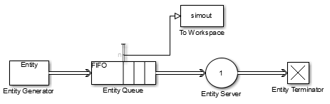 В примере показан один способ записи времени и значений сигналов в рабочую область MATLAB. В этом случае сигнал представляет собой n выходных данных блока Entity Queue, который указывает, сколько объектов находится в очереди.