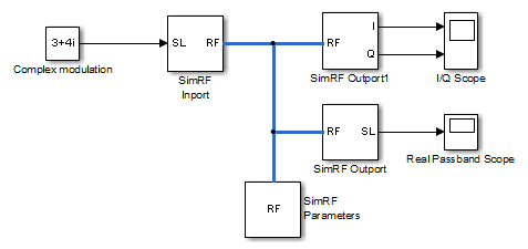 Модель, ex_simrf_tut_passband, показывает, как модулировать реальный сигнал полосы пропускания с синфазными и квадратурными компонентами.