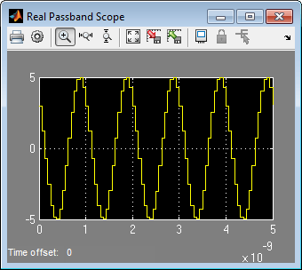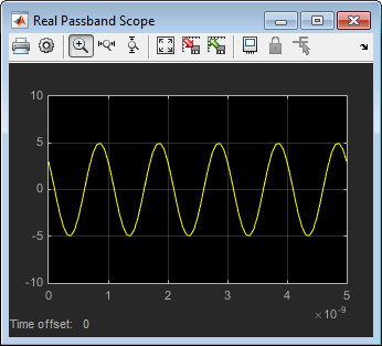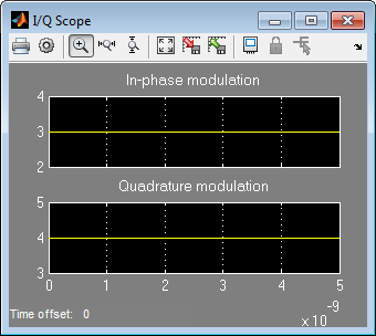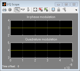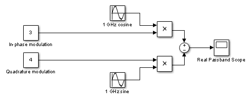 Сама несущая 1-GHz не отображается в выходных данных. Результаты соответствуют реальной и мнимой части Комплексной модуляции на входе системы. Они также соответствуют блокам синфазной модуляции и квадратурной модуляции в Simulate a Passband Signal в Simulink Software.