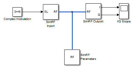 В блоке, обозначенном RF Blockset Outport1 block, также как Outport block, параметр Carrier frequences определяет сигнал, выводимый в 1e9 Hz несущая (1 ГГц) в виде сигналов Simulink. Эти сигналы появляются на портах I и Q. Параметр Output имеет значение In-phase and Quadrature Basebandтаким образом, эти сигналы представляют синфазную и квадратурную модуляции сигнала на несущей 1-GHz.