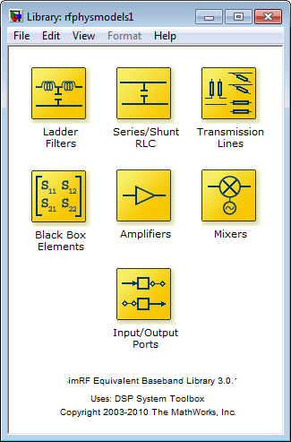 Блоки библиотеки RF Blockset Equivalent Baseband используются для представления компонентов радиочастотной системы в модели Simulink. Блоксеть предоставляет несколько типов представлений компонентов с использованием параметров сети (формат S, Y, Z, ABCD, H и T), математических описаний и физических свойств.