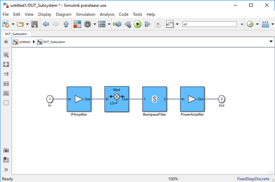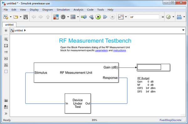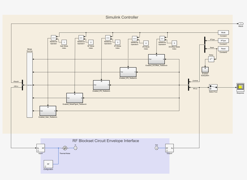 Подсистема RF Measurement Unit состоит из контроллера Simulink и интерфейса RF Blockset Circuit Envergy. Интерфейс RF Blockset используется в качестве входных и выходных данных DUT.