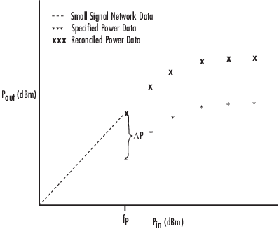 Если ΔP больше 0,4 дБ, появляется предупреждение, и блоксеть добавляет ΔP к значениям выходной мощности при каждом заданном значении входной мощности для устранения расхождений при моделировании. Это расхождение показано на следующем графике.
