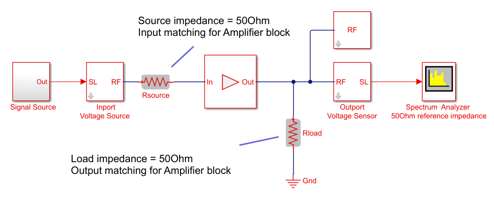 Опция питания автоматически вставляет импеданс источника или нагрузки в сеть и нормирует мощность сигнала относительно заданного импеданса. Вам не нужно вручную вставлять выводы источника и нагрузки, и ваши сигналы автоматически масштабируются между RF Blockset и средой Simulink, которая предполагает неявный опорный импеданс 1 Ом.