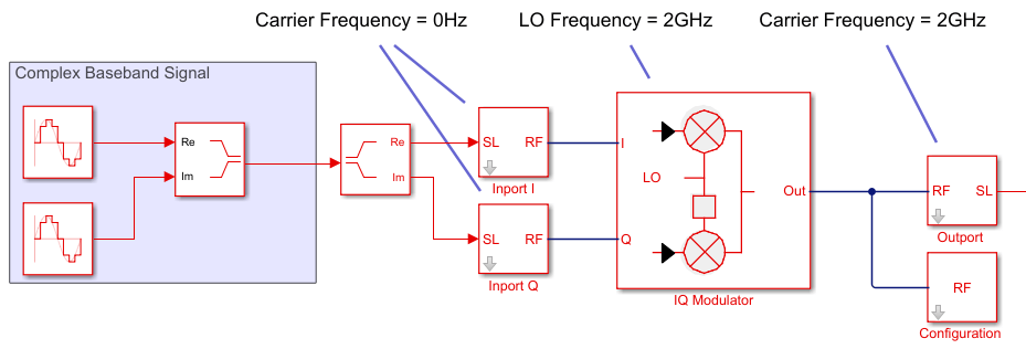 Используйте для двух блоков ввода для I и Q компонентов входного сигнала. Установите параметр Carrier Frequences каждого блока Inport в значение 0