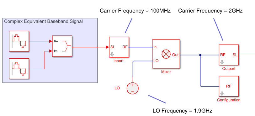 Если радиочастотная цепь не включает в себя модулятор или демодулятор, используйте блок Outport в конце цепочки. Вы можете использовать Outport блок для проверки комплексного эквивалентного сигнала с центром Fc.