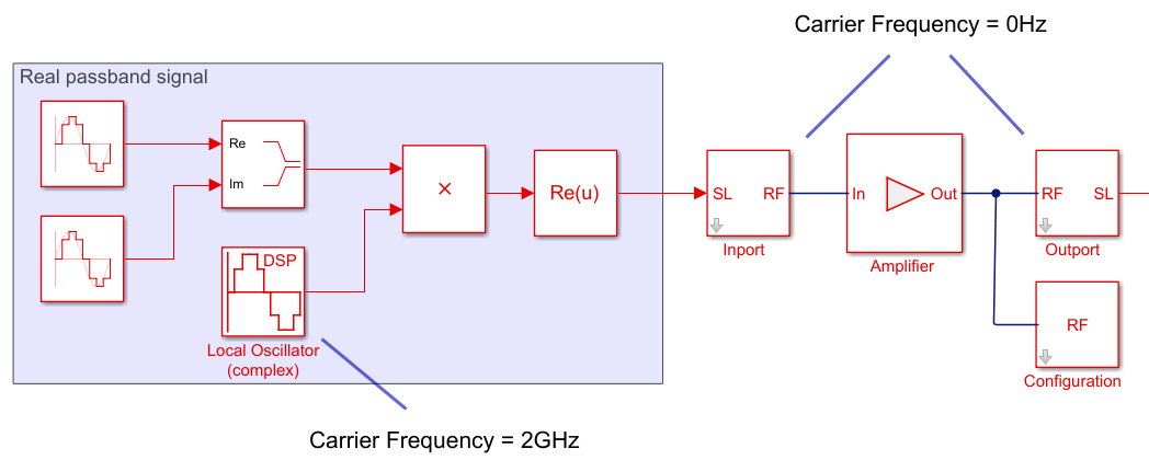 Входной сигнал представляет собой цифровой комплекс связи, эквивалентный сигналу основной полосы частот (I, Q). Предполагается, что неявная несущая для системы равна несущей частоте ,Fc. Вы хотите смоделировать радиочастотные эффекты, такие как нелинейность усилителя и фильтры S-параметров, с помощью RF Blockset: