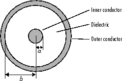 Coaxial - линия передачи как коаксиальная линия передачи. Коаксиальная линия передачи показана в поперечном сечении на следующем рисунке. Его физические характеристики включают радиус внутреннего проводника, а и радиус внешнего проводника b.