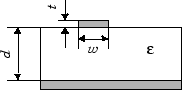 Microstrip - линия передачи как микрополосковая линия передачи. Микрополосковая линия передачи показана в поперечном сечении на следующем рисунке. Его физические характеристики включают в себя ширину микрополосковой полосы, w, толщину микрополосковой полосы, t, высоту подложки, d и относительную постоянную диэлектрической проницаемости
