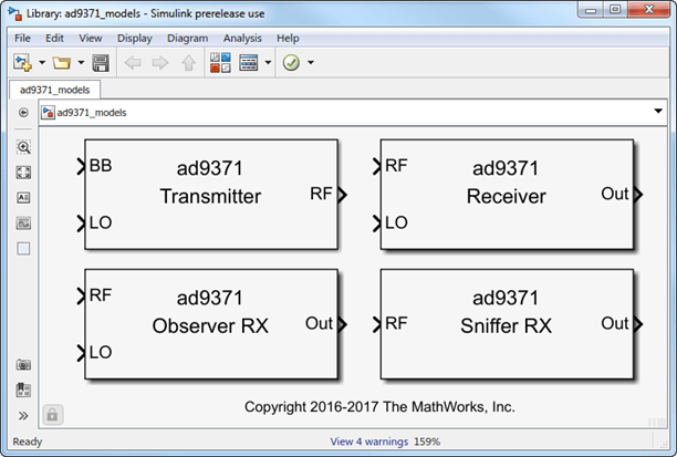 Модели AD9371 можно использовать для моделирования моделей аналоговых устройств ® AD9371 RF передатчика, приемника, наблюдателя и анализатора. Эти модели также помогают увидеть влияние дефектов РЧ на передаваемый или принимаемый сигнал.