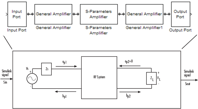 Блоксеть предоставляет возможность интерпретировать входной сигнал Simulink, Sin, как падающую волну мощности, ap1, на первом порте радиочастотной системы. На следующем рисунке показана модель для этой интерпретации.